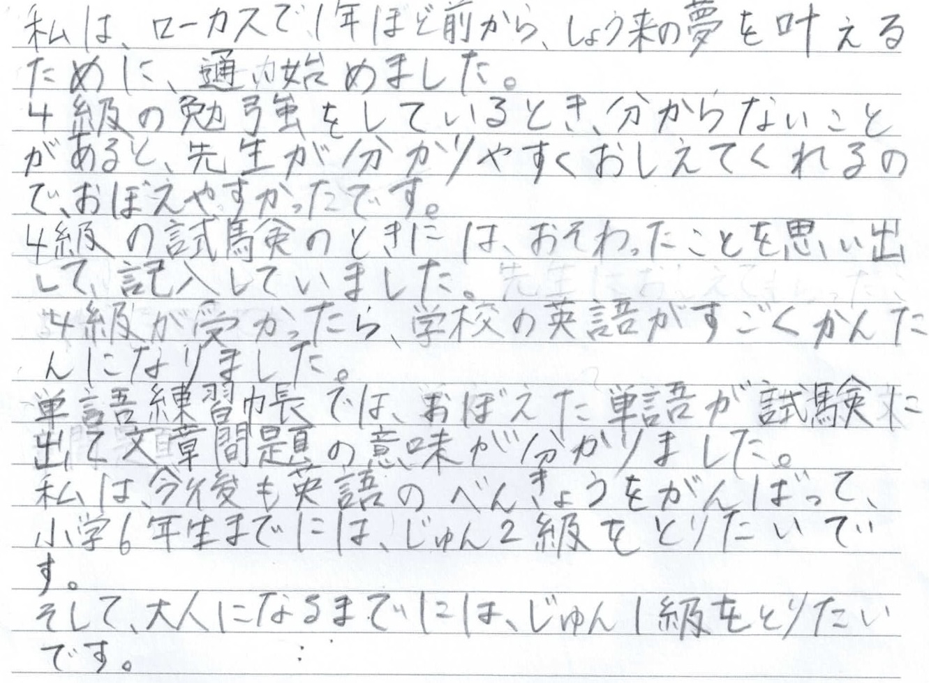 私は今後も英語の勉強を頑張って、小学6年生までには、準2級を取りたいです。