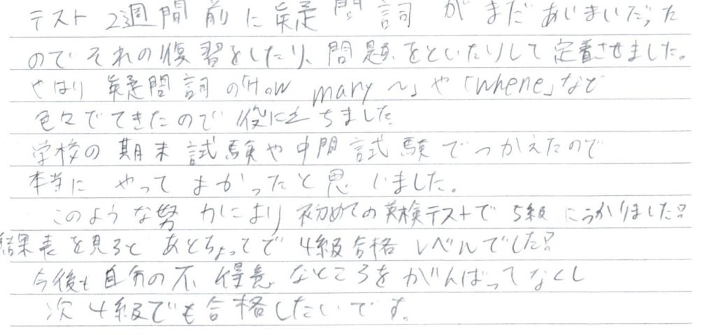 2025年12月18日 / 最終更新日 : 2025年12月18日 muna 5級 合格体験記 5級 中1 HMさん テスト2週間前に疑問詞がまだ曖昧だったのでそれの復習をしたり、問題を問いたりして定着させました。 やはり疑問詞のHow many〜やWhereなど色々でてきたので役に立ちました。 学校の期末試験や中間試験で使えたので本当にやってよかったと思いました。 このような努力により初めての英検テストで5級に受かりました。 結果表を見るとあとちょっとで4級合格レベルでした。 今後も自分の不得意なところをがんばってなくし、次4級も合格したいです。
