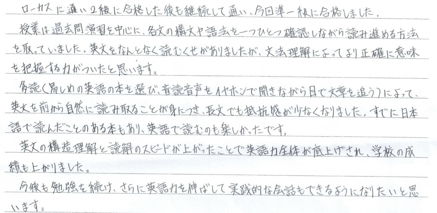 ローカスに通い2級に合格した後も継続して通い、今回準一級に合格しました。