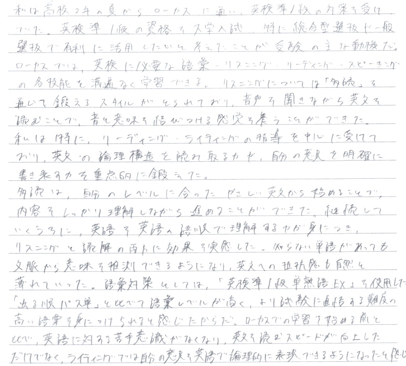 私は高校2年の夏からローカスに通い、英検準1級の勉強を受けていた。