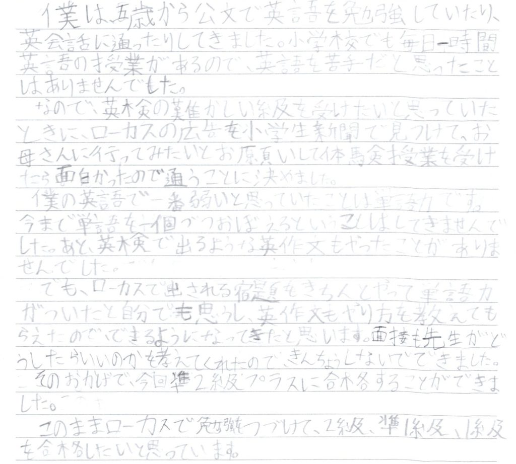 でも、ローカスで出される宿題をきちんとやって語彙力がついたと自分でも思うし、英作文もやり方を教えてもらえたので書けるようになってきたと思います。