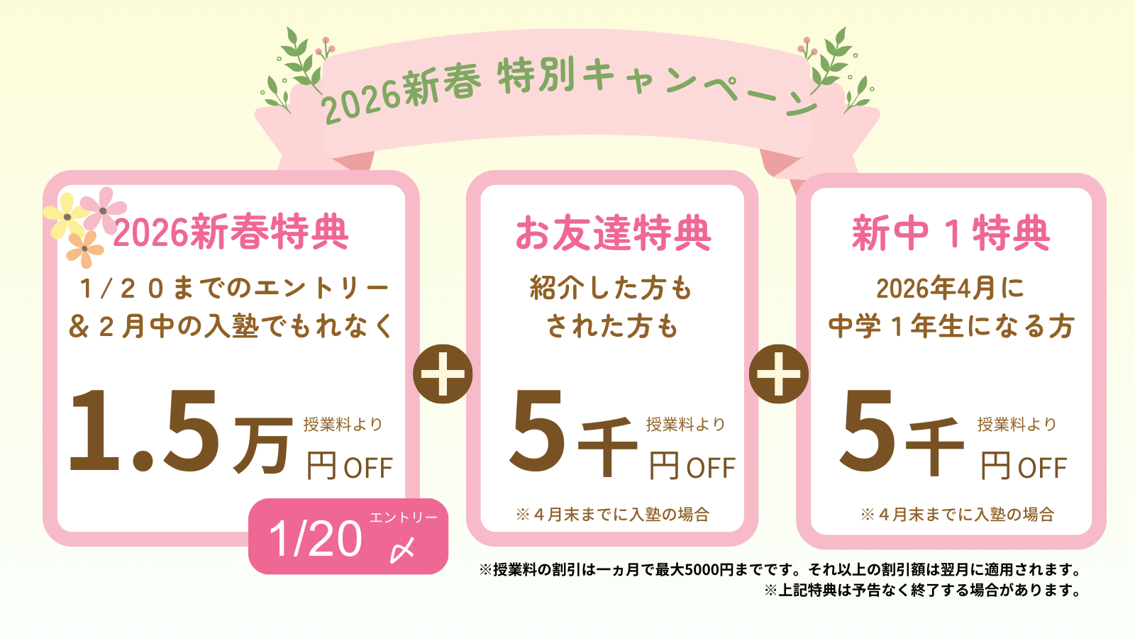 現在、新学年に向けて特別キャンペーンを実施中です。ぜひ下記よりエントリーの上、無料体験授業へお越しください。